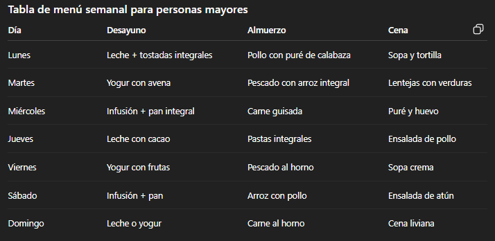 Este menú semanal está diseñado para aportar los nutrientes necesarios sin complicar la cocina. Las porciones deben adaptarse a cada persona, según su apetito, estado de salud y recomendaciones médicas.